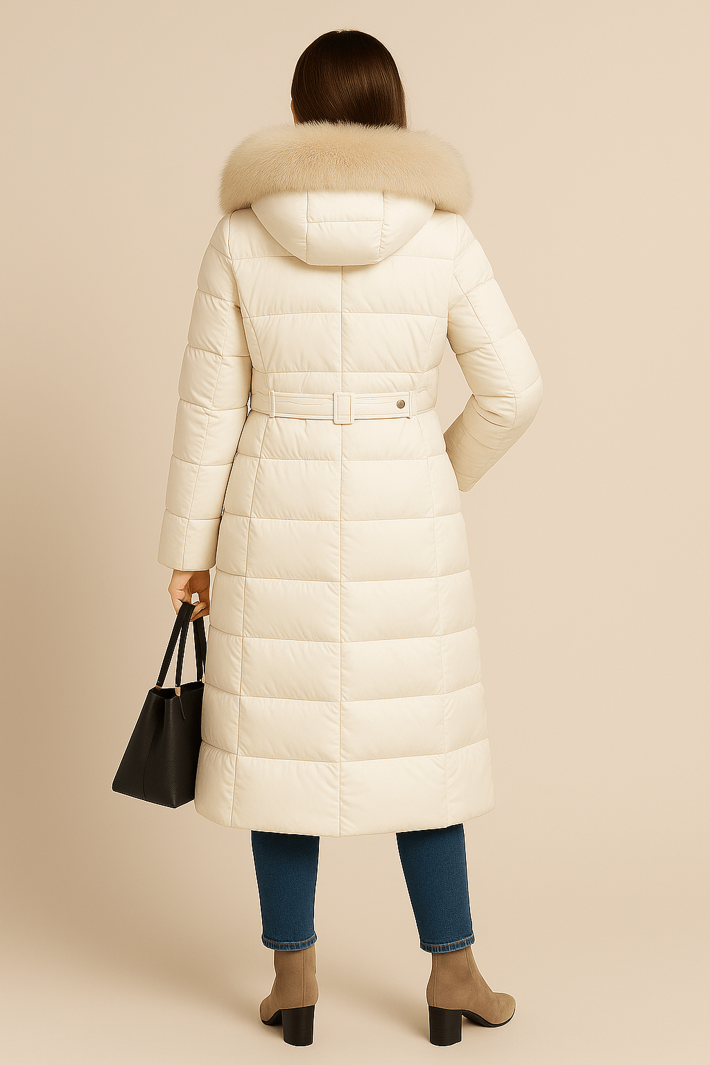 Luxurious and warm winter parka for women with faux fur collar and belted waist. Available in multiple colours and sizes.
